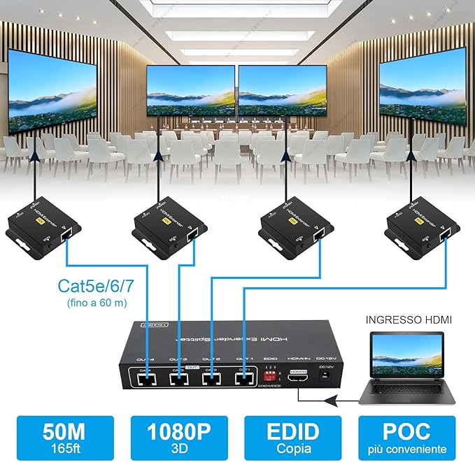 Alquiler divisor extensor 4 salidas de señal de video HDMI, utiliza cables utp/ftp RJ45 para la transmisión de video hasta el receptor. No necesita alimentación externa el receptor. Alcance de 50m entre emisor y receptor.
