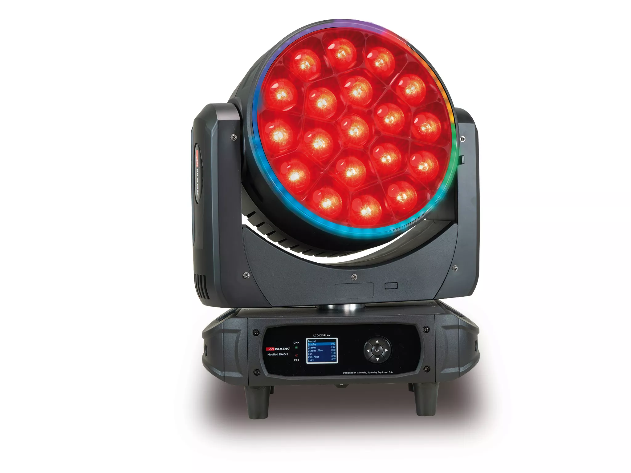 MOVILED 1940 S es una cabeza móvil que incluye 19 LEDs RGBW de 40w cada uno, mas giro de lente para crear efecto spiider